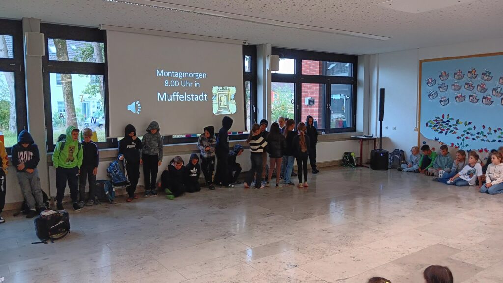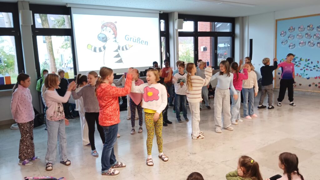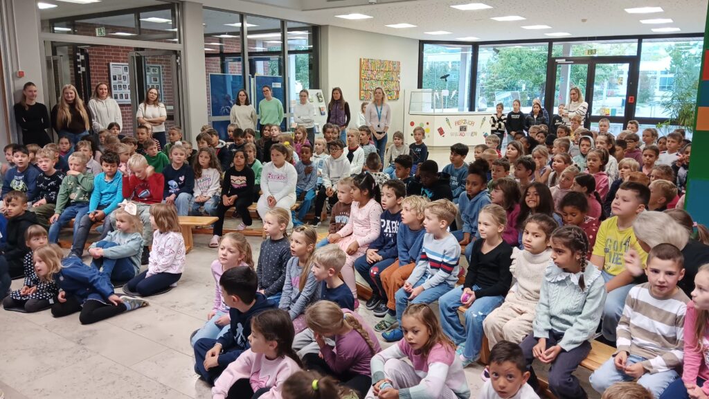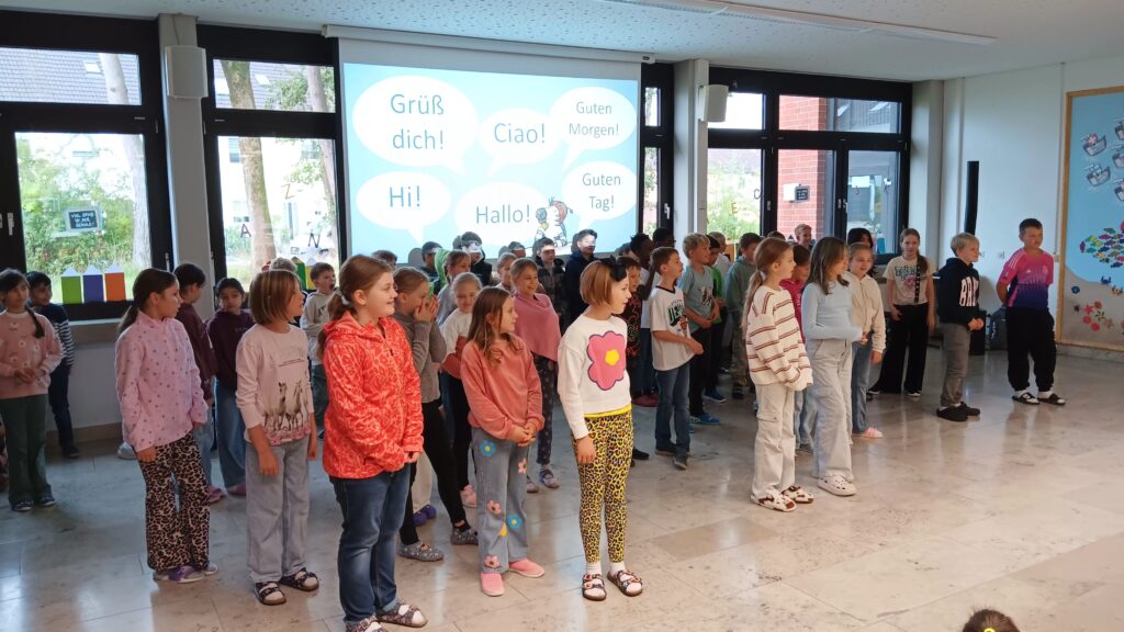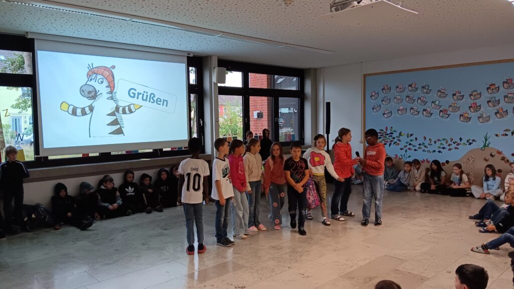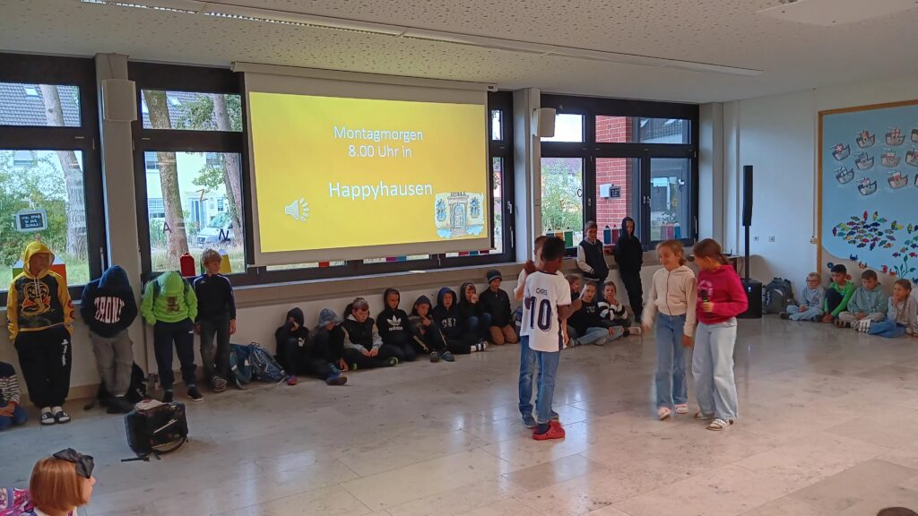 Am 29. September 2025 fand in der Aula die erste Vollversammlung der Schule in diesem Jahr statt. Hierbei wurde das Monatsmotto „Grüßen“ thematisiert. Die Kinder der Klasse 4a zeigten mit kleinen Sketchen aus den fiktiven Schulen in Muffelstadt und Happyhausen wieso, wie und wann man Kinder und Erwachsene begrüßt. Mit dem Lied „Hallo Ciao, Ciao“ stimmten die Viertklässler zum Abschluss die ganze Schulgemeinschaft nochmals auf das richtige Grüßen ein.