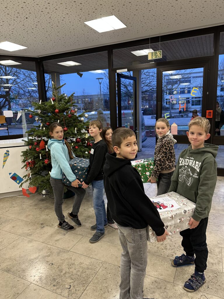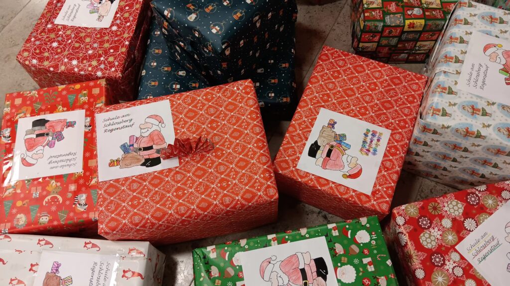 Auch in diesem Schuljahr beteiligte sich die Grundschule am Schlossberg wieder an der Aktion Antenne Bayern Weihnachtstrucker. Eifrig packten die Schüler und Schülerinnen mit ihren Lehrkräften Zucker, Mehl, Reis, Nudeln, Speiseöl, Kekse, Schokolade, Zahnpasta, Seifen und Zahnbürsten in die Kartons. Neben den Grundnahrungsmitteln und Hygieneartikeln enthalten die Päckchen obendrein auch wieder ein kleines Geschenk für Kinder. Am Ende standen 14 Päckchen unterm Christbaum. Herzlichen Dank an alle Spender!