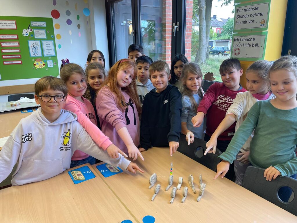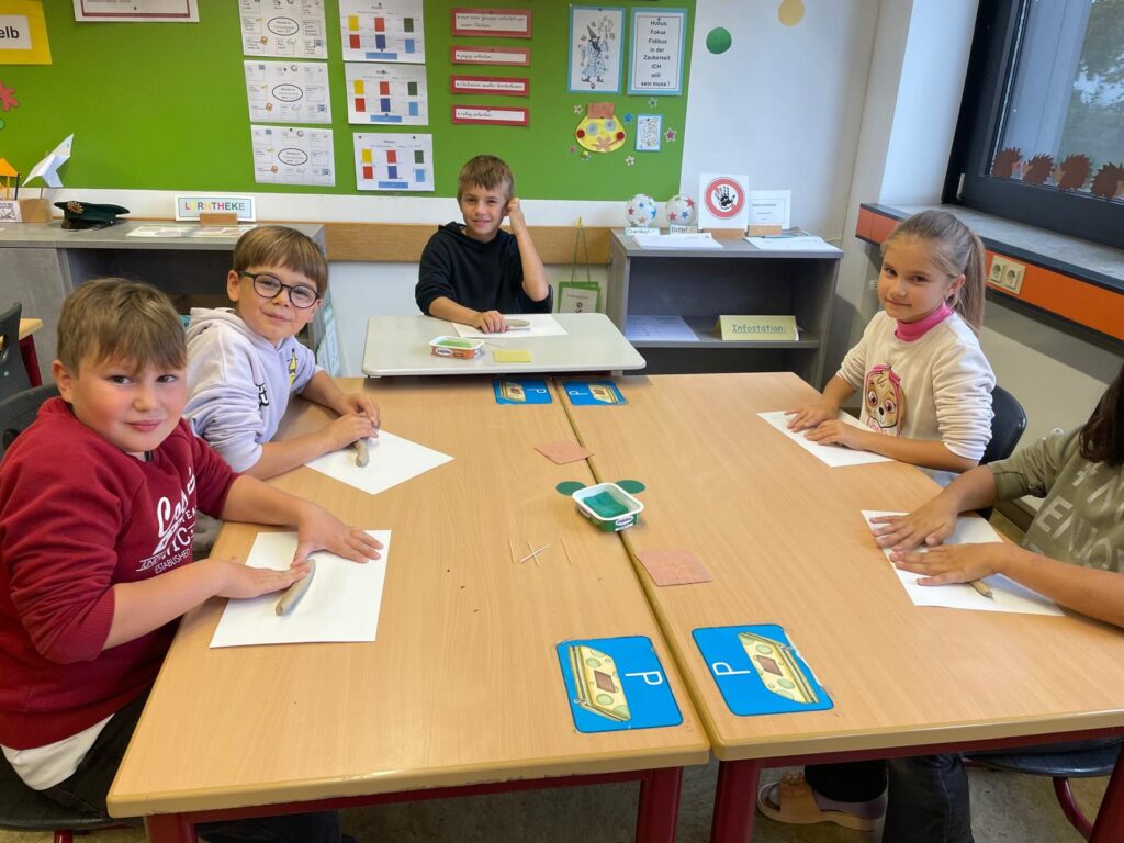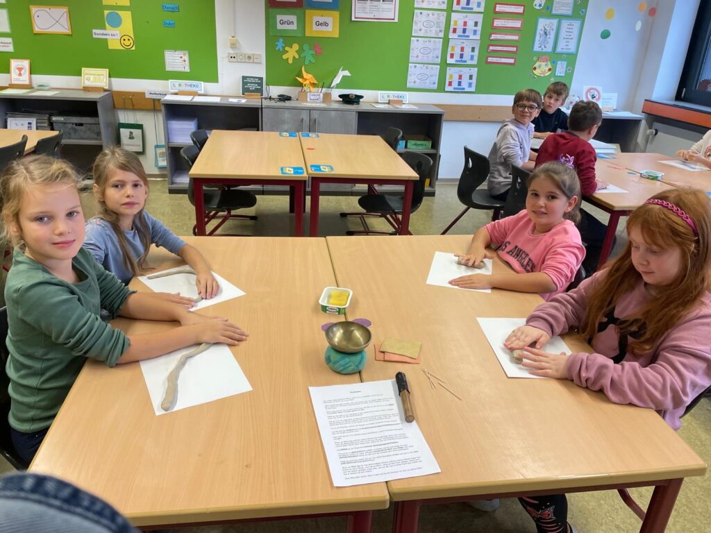 In Werken und Gestalten formten die 3. Klassen eine Schnecke aus Ton. Anschließend bogen sie einen Draht in Spiralform und befestigten diesen mit bunten Kugeln in der Schnecke. Stolz präsentierten die Kinder ihren schönen Notizhalter!
