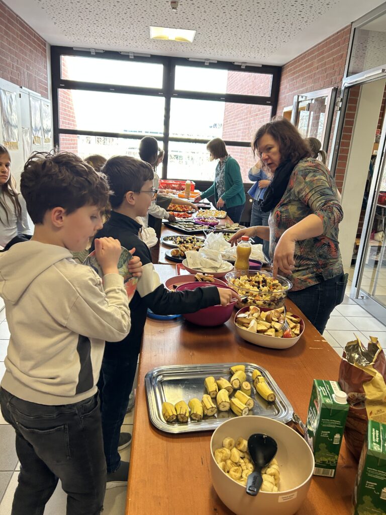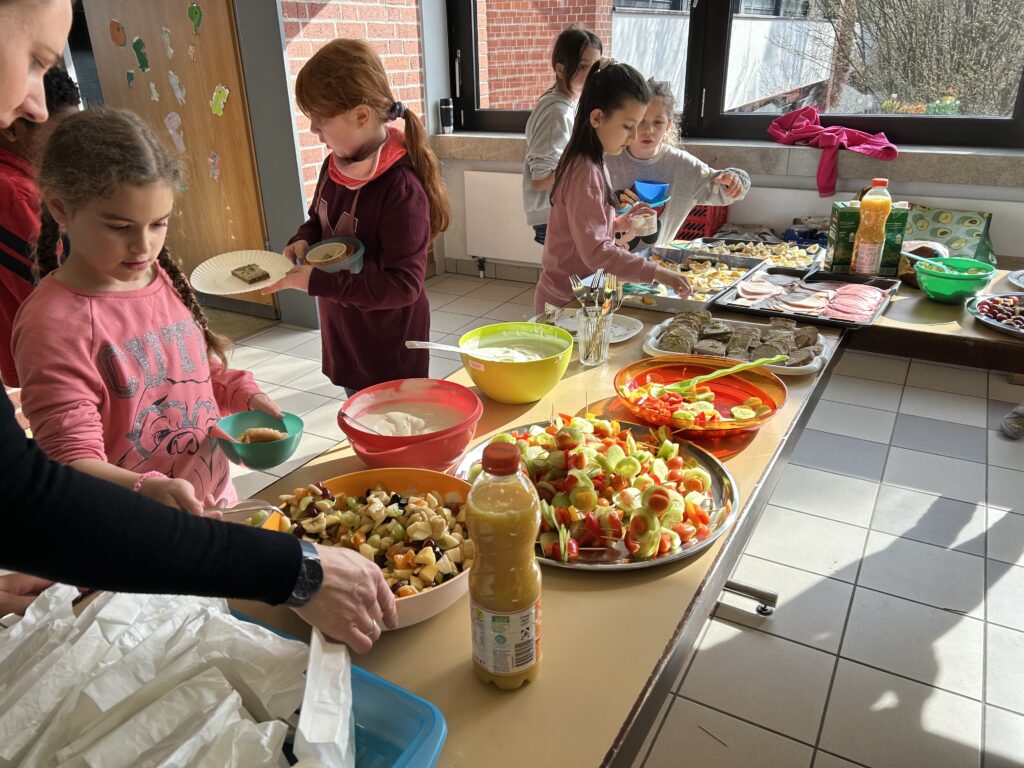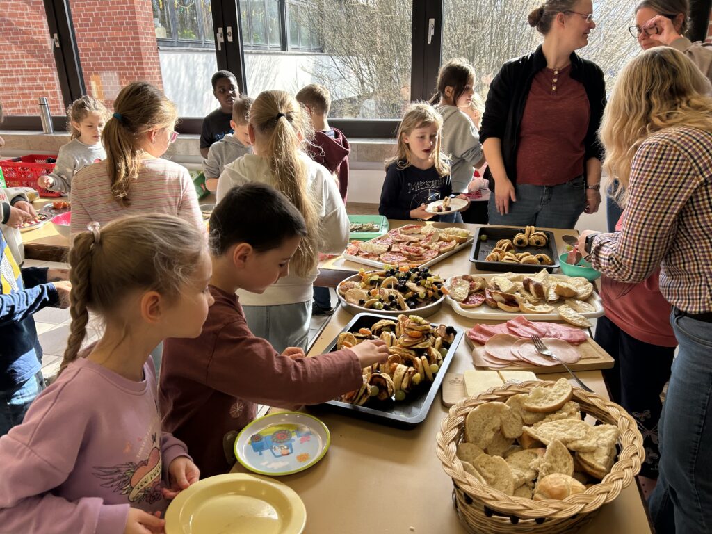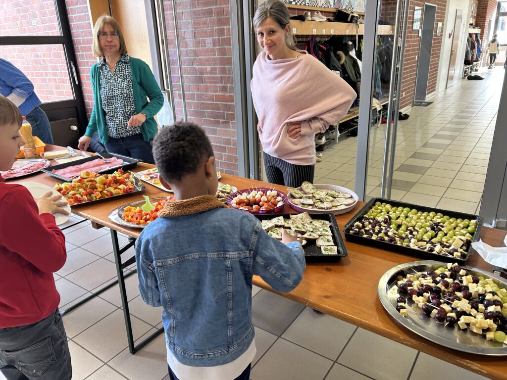 Ein gesundes und leckeres Buffet bereitete der Elternbeirat am 19. März 2026 wieder für alle Schülerinnen und Schüler vor der großen Pause. Eine große bunte Tafel mit vielen Obst- und Gemüsespießen, liebevoll hergerichteten Platten mit Schnittlauchbroten, Käse- und Wurstsemmeln sowie Naturjogurt mit Müsli und frischen Früchten wartete auf die Kinder. Zuvor hieß es aber für alle Schüler und Schülerinnen schnippeln, schneiden, streichen und das Buffet mit vorzubereiten. Die Kinder freuten sich sehr auf das leckere Essen und lernten zugleich, dass gesundes Essen auch sehr gut schmecken kann. Diesmal gab es auch Pancakes, die von mehreren Müttern unter der Federführung von Mona Schindler zubereitet wurden.