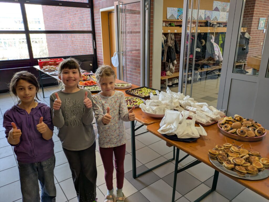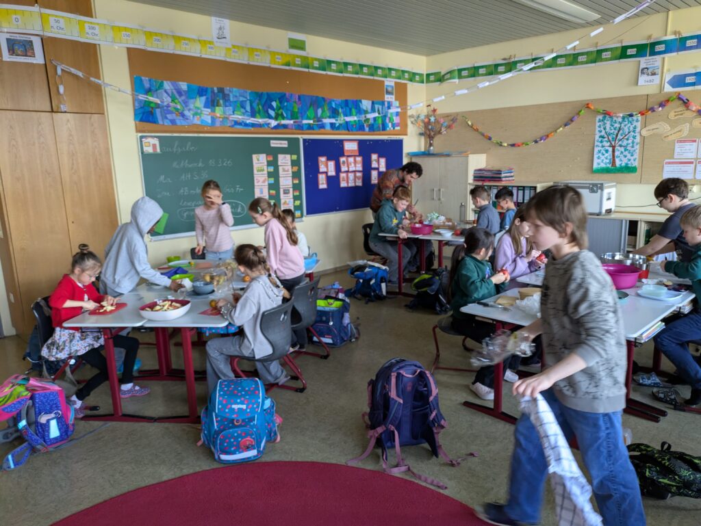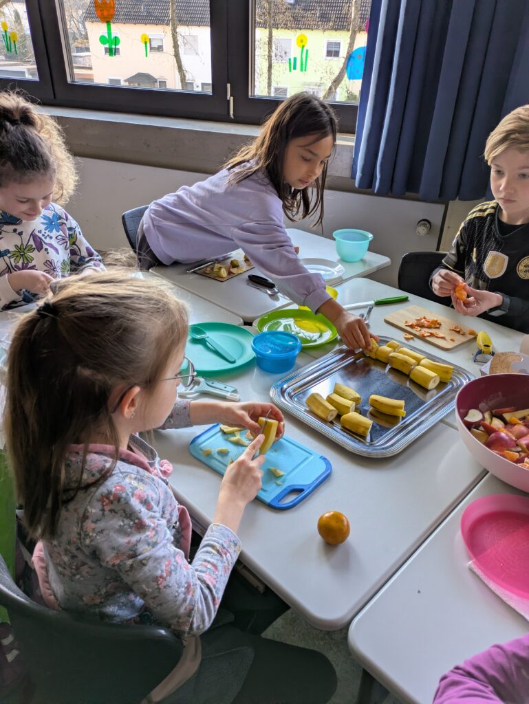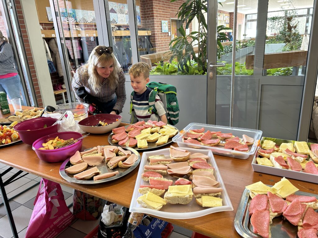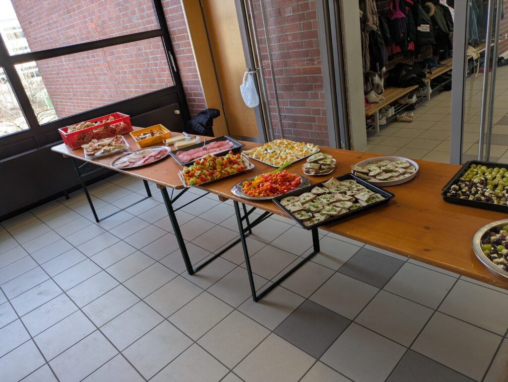 Ein gesundes und leckeres Buffet bereitete der Elternbeirat am 19. März 2026 wieder für alle Schülerinnen und Schüler vor der großen Pause. Eine große bunte Tafel mit vielen Obst- und Gemüsespießen, liebevoll hergerichteten Platten mit Schnittlauchbroten, Käse- und Wurstsemmeln sowie Naturjogurt mit Müsli und frischen Früchten wartete auf die Kinder. Zuvor hieß es aber für alle Schüler und Schülerinnen schnippeln, schneiden, streichen und das Buffet mit vorzubereiten. Die Kinder freuten sich sehr auf das leckere Essen und lernten zugleich, dass gesundes Essen auch sehr gut schmecken kann. Diesmal gab es auch Pancakes, die von mehreren Müttern unter der Federführung von Mona Schindler zubereitet wurden.