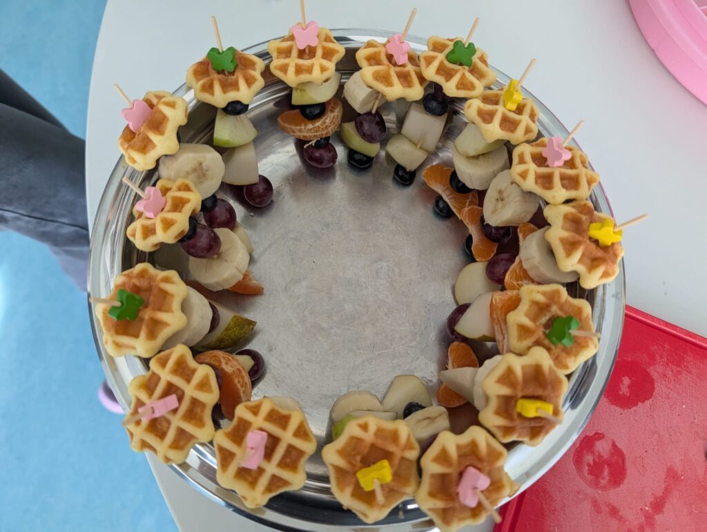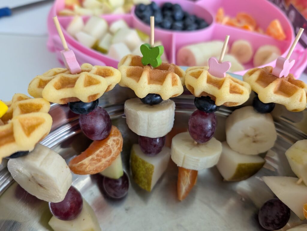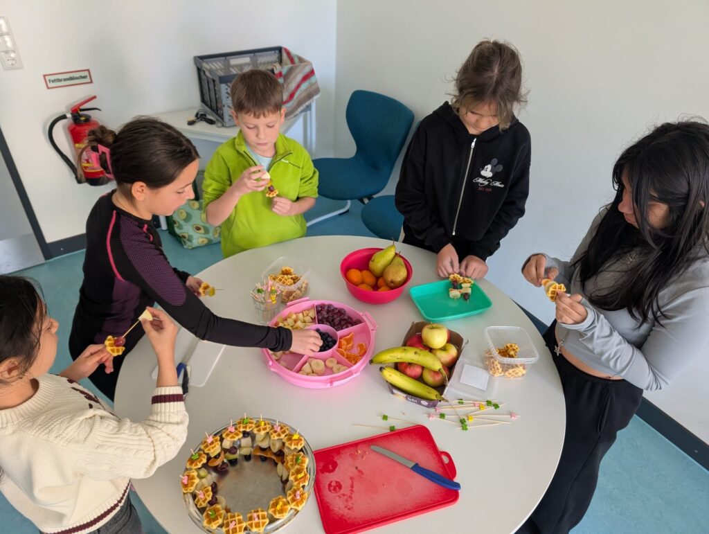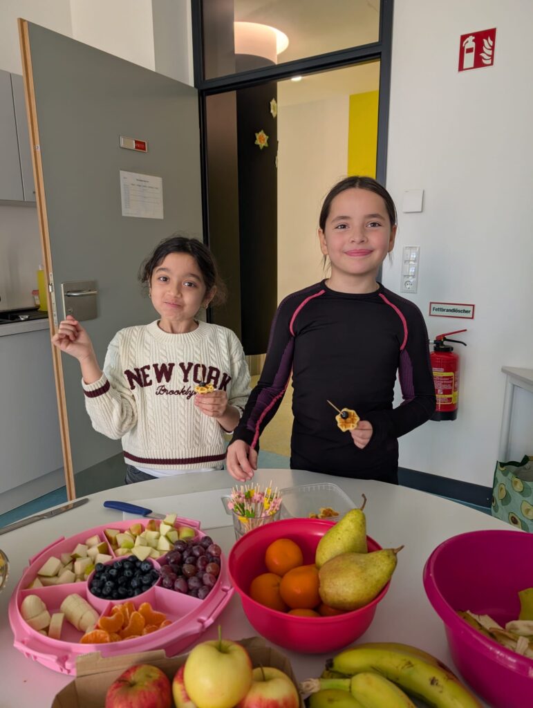 Nachdem wir uns in Deutschplus mit dem Thema „Rezepte schreiben“ beschäftigt haben, wollten wir endlich selbst ran ans Werk. Fleißig wurde geschält, geschnitten und aufgespießt, um die bunten Obstspieße anschließend stolz an unsere Klassenkameraden und -kameradinnen zu verteilen.