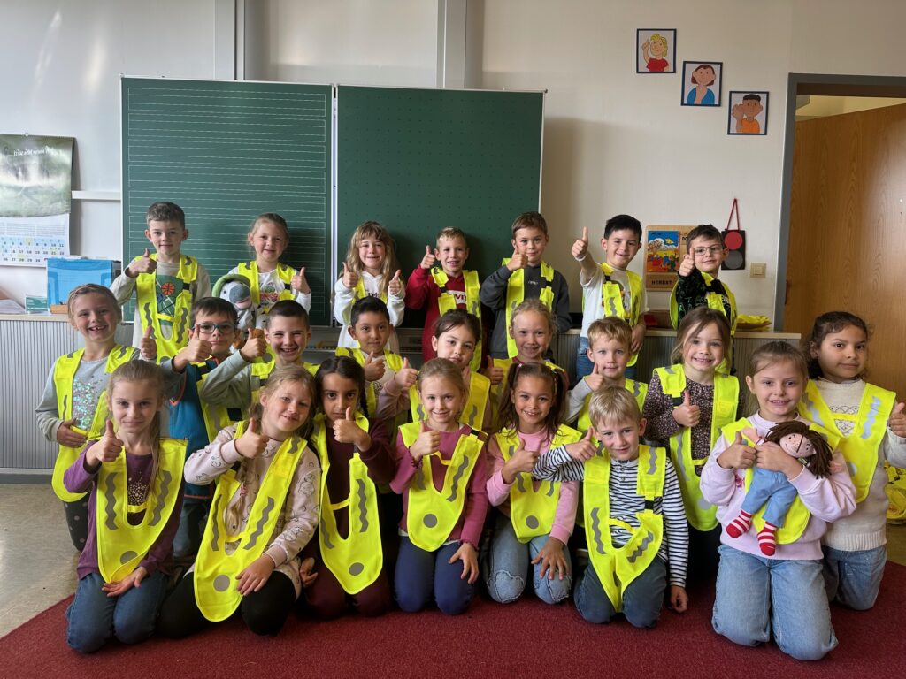 Damit unsere Schülerinnen und Schüler der 1. Klasse sicher zur Schule und nach Hause kommen, spendete die Deutsche Verkehrswacht Regensburg allen Kindern Warnwesten mit Reflektoren, um auch in der Dunkelheit und bei Nebel gut sichtbar zu sein und damit das Unfallrisiko zu minimieren. Vielen Dank für die Spende!